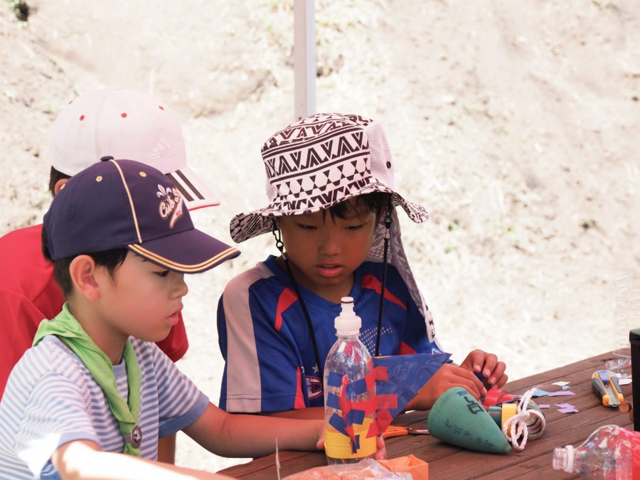 ペットボトルデコ大会、飛距離競争、的当て競争、着地競争です。