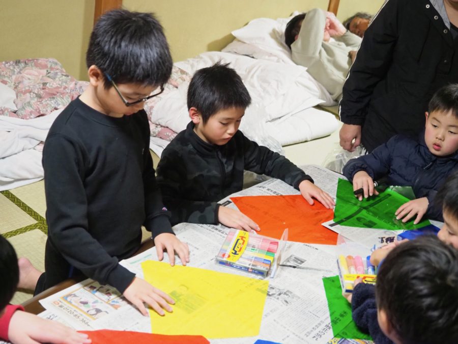 宿ではBP祭に使用する凧揚げの凧にイラストを描き